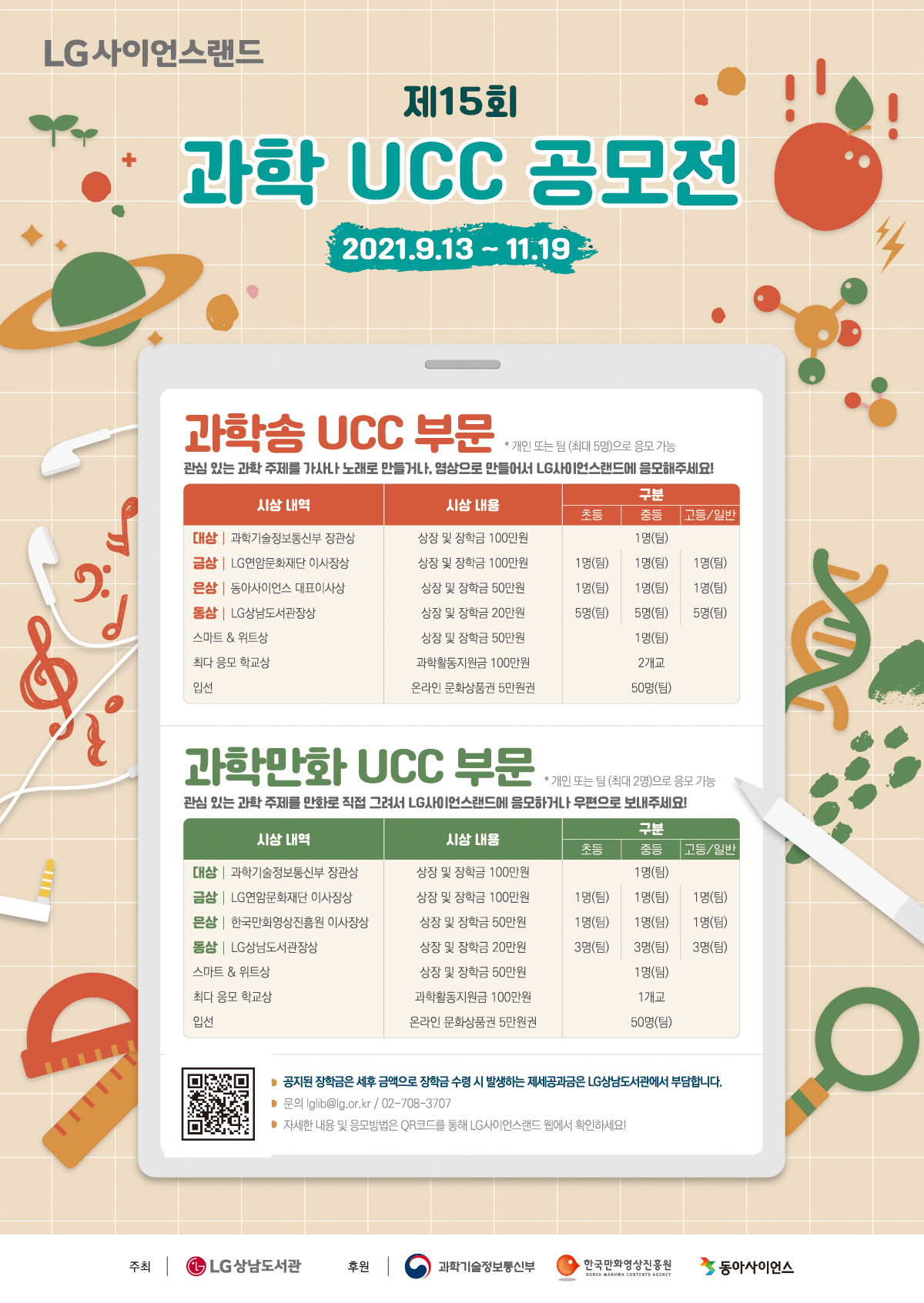 9월 13일부터 11월 19일까지, LG사이언스랜드에서 제15회 과학UCC 공모전이 개최되고 있어 안내드리고자 인사드리게 되었습니다.