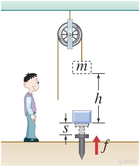 위 상황을 (질량 m인 물체의 위치 에너지 감소량)=(말뚝에 한 일의 양)으로 설명하고, 말뚝에 한 일의 양은 f(마찰력)Xs(이동거리)로 설명하는 것으로 알고 있습니다.