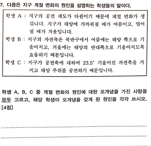 기출 2007년도 4번 오개념 (지구과학) 작성자(ㅇ_ㅇ)♡|작성시간14.07.06|조회수667 목록 댓글 2 글자크기 작게가 글자크기 크게가 계절 변화 오개념이 학생 A와 B인거 같구요.. C는 잘 모르겠어요ㅠㅠ ;;;;;;;이런 오개념을 갖게된 원인은 잘 모르겠어요ㅠㅠ 태양이 가까운게 여름이다 라고 생각하는거 같은데... 각각 쓰려고 하다보니 모라고 써야할지;; 도와주세요!! 다음검색 현재 게시글 추가 기능 열기 북마크 공유하기 신고 센터로 신고 댓글 댓글 2 댓글쓰기 답글쓰기 댓글 리스트 작성자1급F유 | 작성시간 14.07.06 A 복사원(난로 등의 열원)과 거리가 가까울수록 따뜻하다는 일상적인 경험에 의해 오개념이 형성B 지구 자전축이 세차운동에 의해 26000년의 주기로 요동한다는 과학적 개념과의 혼동 즉 수업시간에 학습한 과학개념들이 정교화되지 않아 개념들이 뒤섞여서 오개념 형성인것 같습니다만... 답댓글 작성자(ㅇ_ㅇ)♡ 작성자 본인 여부 작성자 | 작성시간 14.07.07 감사합니다!!! :) 댓글 전체보기