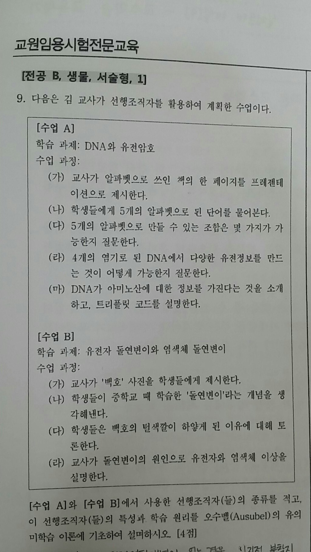 A의경우 DNA에 대한 관련정착개념이 없어 알파벳이라는 설명선행조직자를 택했고, B의 경우 백호라는 돌연변이 개념이 있어 비교라고 생각했어요
