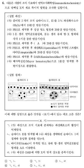 ㄹ. (사)에서 헤마톡실린은 핵을 염색시키는 염색약입니다. 따라서 ㄹ지문에서 언급하고 있는 DAB와 관련이 없고, 실험 결과의 슬라이드 1, 2에서 핵이 검게 관찰이 되는 것과 관련있습니다. -