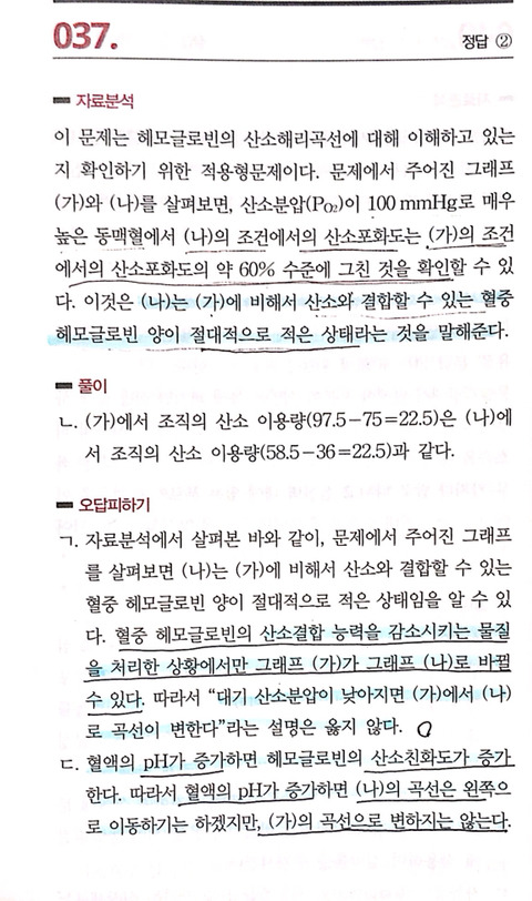 ㄱ의 해설에서 산소결합능력을 감소시키는 물질을 처리한 상황에서만 그래프 (가)가 (나) 그래프로 바뀔수 있다. 따라서 ㄱ 은 옳지않은 설명이다.