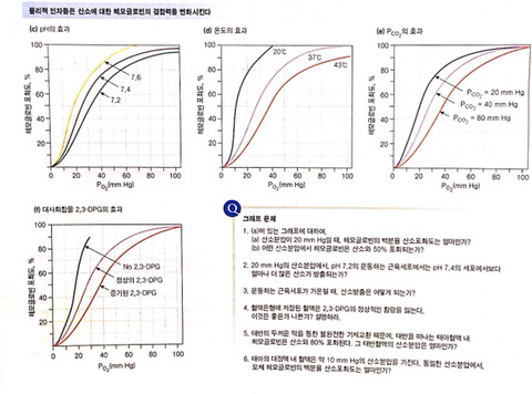 작성자엑디손 작성시간 18.08.05 Hb 산소친화도를 낮추는 조건이면 동일 산소분압에서 산소포화도가 낮아야 하므로 그래프가 오른쪽 이동입니다.