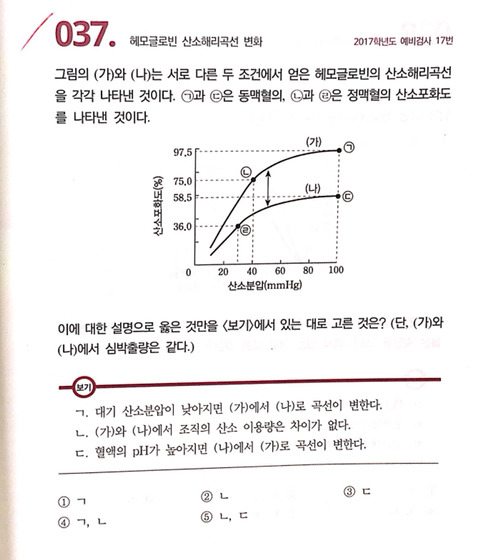 ㄱ보기에서 동맥혈의 O2가 100mmHg인 조건에서도 산소포화도가 낮기 때문에 ㄱ은 완전히 말이 안되는 소리입니다. -