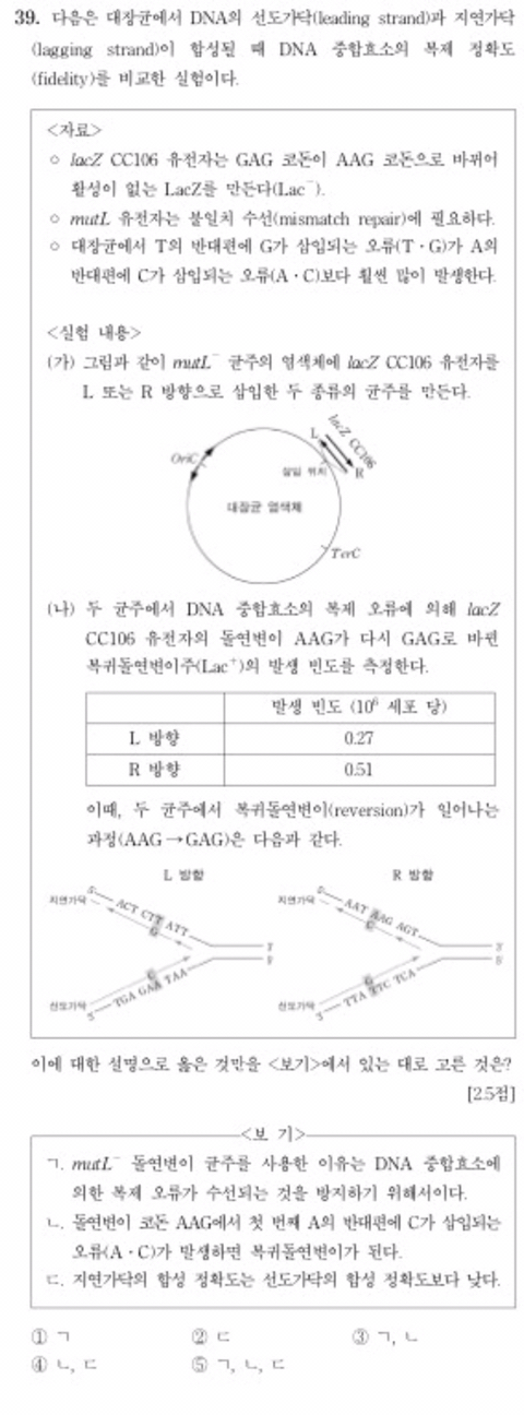 답댓글 작성자홍장군고양이 작성시간 19.07.09 플라보노이드 제가 조건 하나를 놓쳤었네요. AAG→GAG 복귀를 확인하는 실험이라 AAG만 보고 있었습니다. TG쌍의 돌연변이가 훨씬 많이 일어나므로 TG쌍을 보는 것이 맞습니다. 그러면 L방향이 지연가닥, R방향이 선도가닥에 대한 오류발생률을 알려줍니다. 지연가닥에서 돌연변이율이 더 낮으므로 합성 정확도는 더 높습니다.