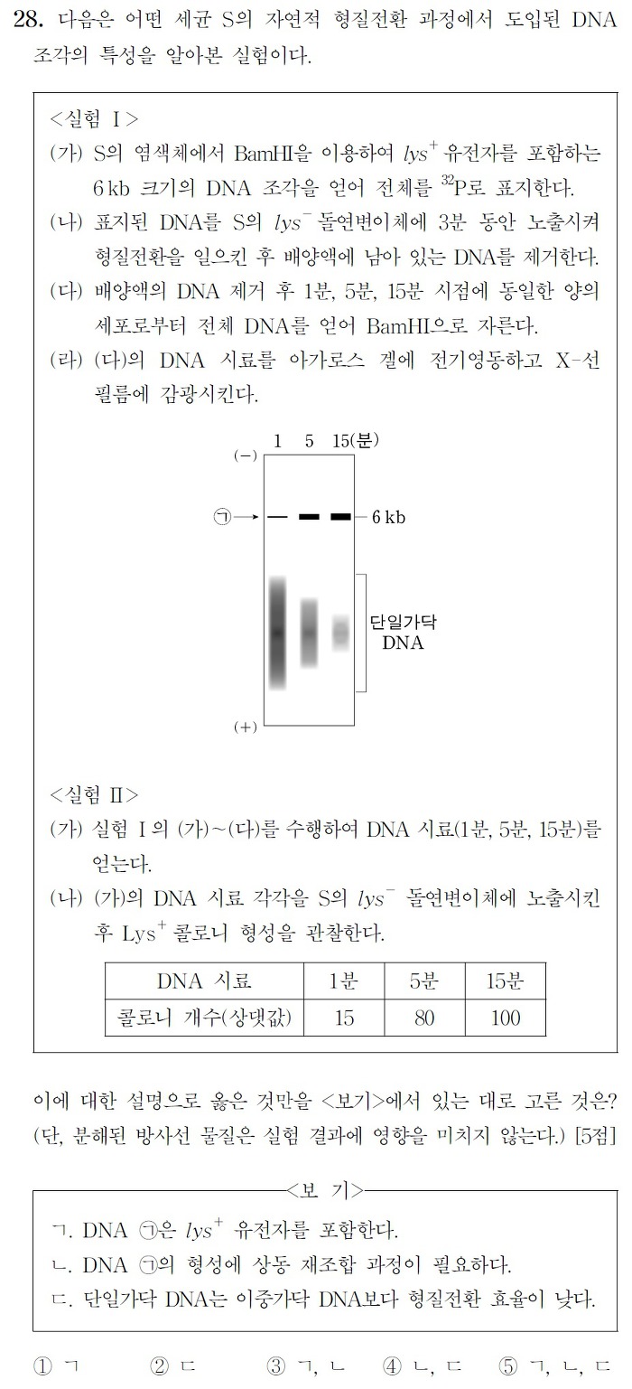 작성자고로케카레 작성시간 21.10.04 선생님ㅠㅠ 저는 이 문제 ㄷ을 접근할 때 (라)의 전기영동 결과에서 단일가닥DNA가 시간이 지날 수록 감소하고, 6kb인 ㄱ이 증가하는 걸 통해 시간에 따라 단일가닥DNA가 형질전환으로 도입되기 때문에 그림과 같은 실험 결과가 나타났다고 해석했습니다.