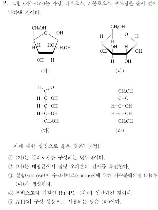 4. RuBP는 리불로오스-1,5-비스인산이다. (라)가 인산화된 것이다. X