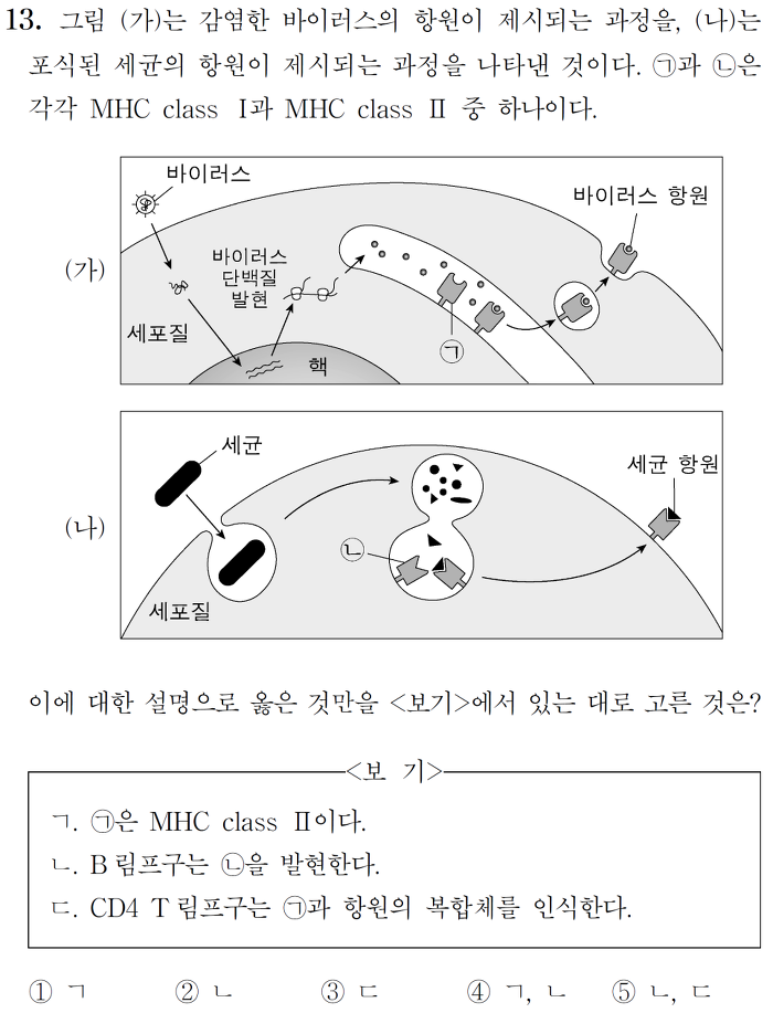 ㄴ. B림프구는 전문항원제시세포의 일종이므로 MHCⅡ인 ㉡을 발현한다. O