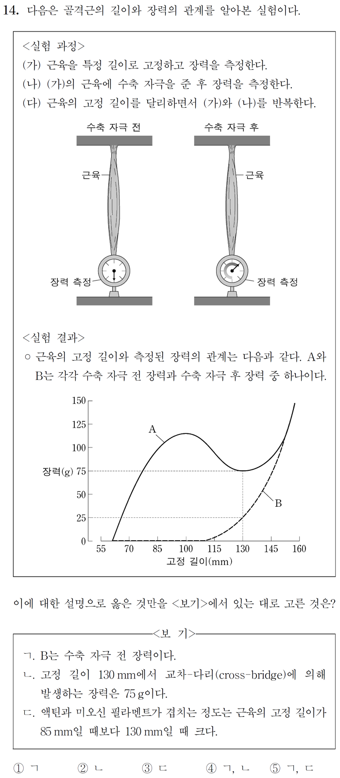 ㄷ. 액틴과 미오신 필라멘트가 겹칠수록 장력의 크기도 크다. 85nm일 때 장력의 크기가 더 크므로 겹치는 정도도 더 크다. X