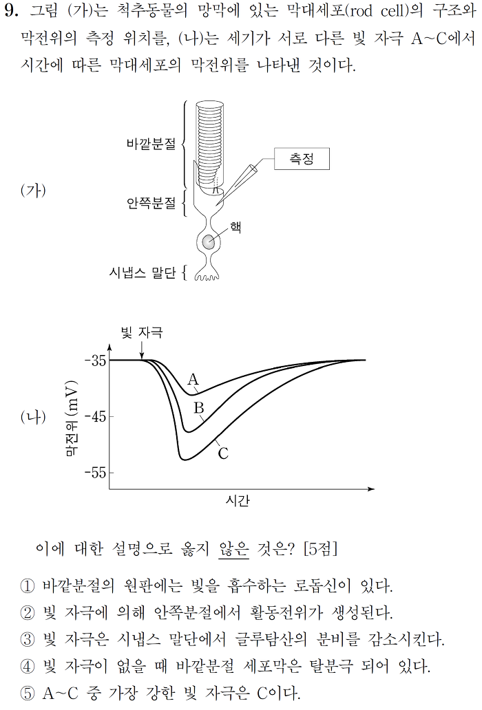 ② 막대세포에서는 수용기 전위만 생성된다. 막대세포(and 원뿔세포)-양극세포-신경절세포로 이어지는 경로에서는 신경절세포부터 활동전위가 발생한다. X