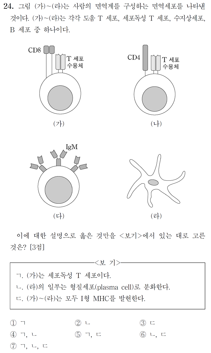 (라)는 특유의 독특한 모양과 문제 조건에 따라 수지상세포임을 알 수 있다.