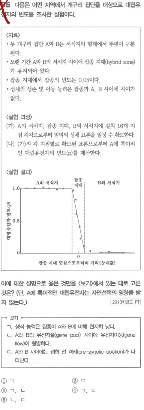 작성자바이오에듀21 작성시간 21.03.23 제 설명이 정확한것은 아닙니다. 다른 분들의 알맞은 풀이를 기대합니다. 일단 제 생각은 답이 1번이고 ㄱ은 잡종지대에서 잡종의 빈도가 자료에서 0.01밖에 되지 않으므로 잡종이 생성이 되었어도 생존능력이나 생식능력이 문제가 있다는 것을 알 수 있습니다. 형성이 되어도 생식에 문제(잡종쇠약)가 있거나 생존자체가 힘들어서 자료에서 0.01밖에 잡종의 빈도가 형성이 되지 않아서 생식능력은 잡종이 낮다고 해석했습니다. 그래서 ㄱ은 옳다고 해석했습니다. . ㄴ은 ㄱ과같은 맥락으로 이해하시면 될것 같습니다. 잡종이 생성되고 정상적으로 생존하고 생장을해서 자손을 생성을 해야 A와 B의 유전자가 활발한 이동이 완성이 되었다고 생각을 하면 ㄴ지문은 틀린 것이라고 생각합니다. ㄷ은 접합전격리가 일어난게 아니라 접합후 격리가 일어난다고 해석을 해야한다고 생각합니다. 접합전 격리가 일어나면 잡종자체가 잡종지대에서 형성이 되지 않았을 겁니다. 그래서 ㄷ지문은 틀렸다고 생각합니다.