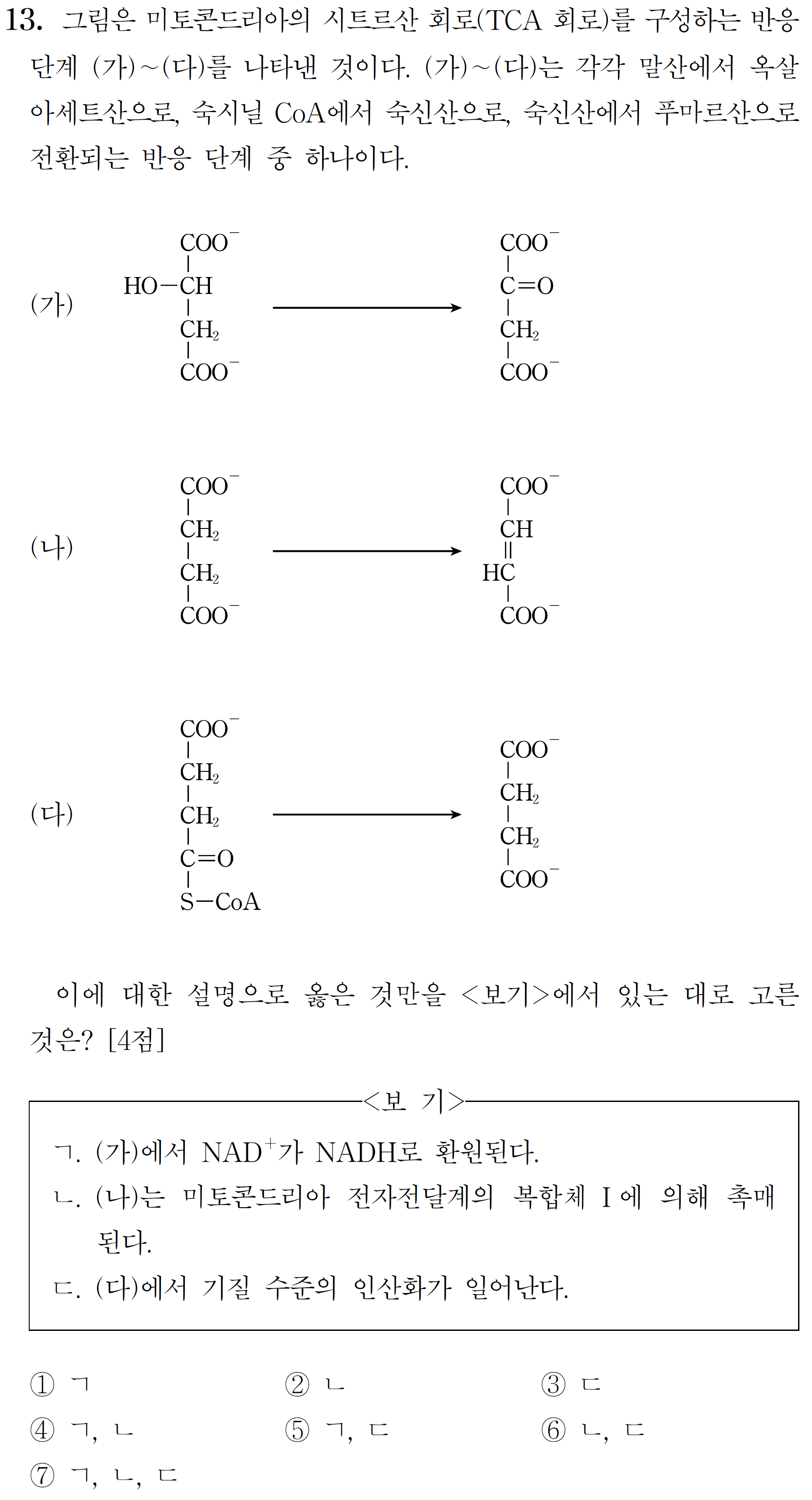 CoA가 있는 (다)부터 판단하고, 숙신산의 모양을 인지한 뒤 (나) 반응을 판단하면 쉽게 구분할 수 있다.