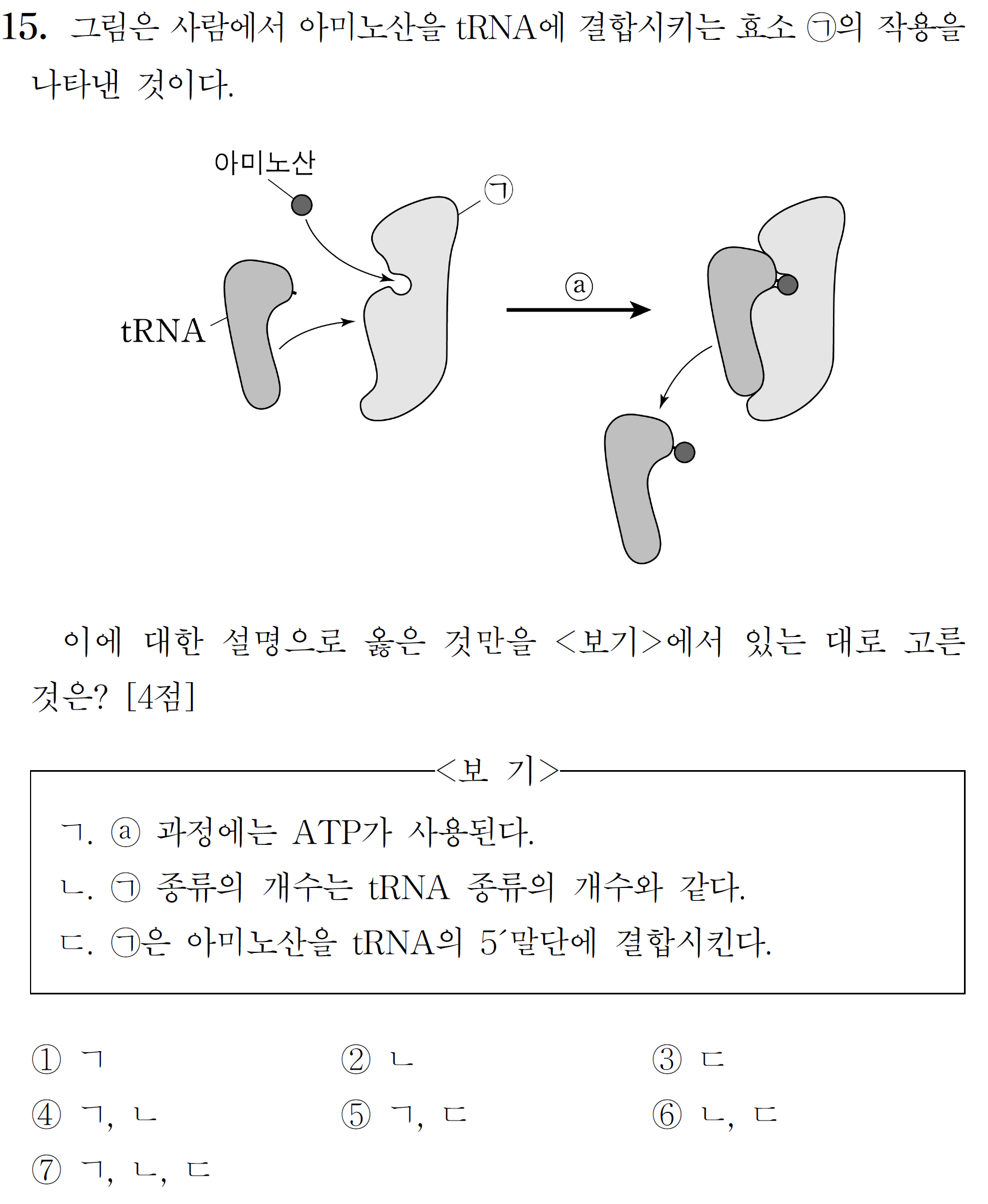 ㄱ. 아미노아실-tRNA가 만들어지는 과정에선 ATP가 사용되어 AMP가 만들어진다. O