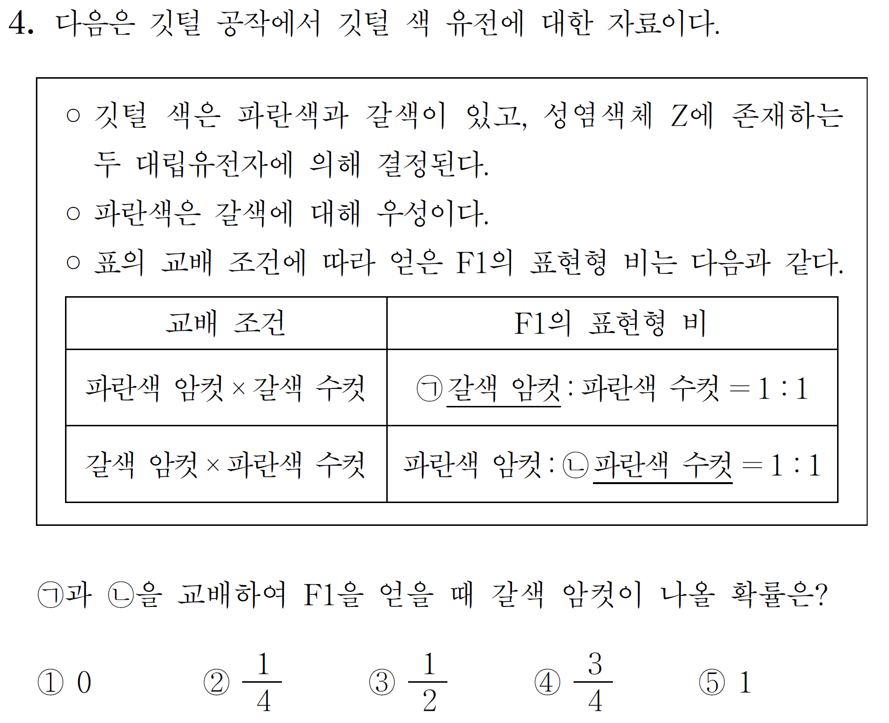 갈색 깃털이 나올 확률은 ㉡에서 b가 선택될 확률이므로 1/2이다.