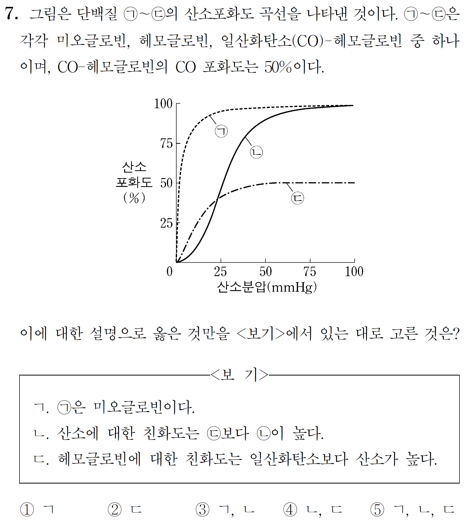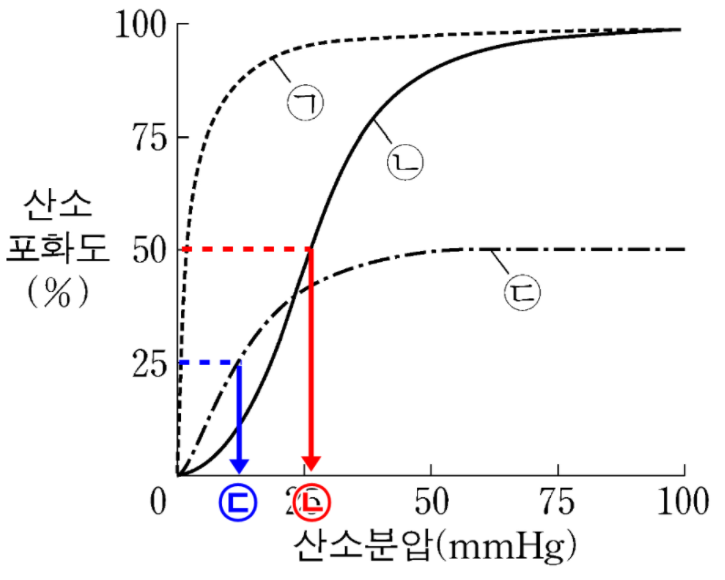 ㄴ. ㉡은 헤모글로빈, ㉢은 CO-헤모글로빈이다. 아래 그림을 참고하면 산소포화도가 최댓값의 50%수준이 되는 산소분압은 ㉢에서 더 낮다.