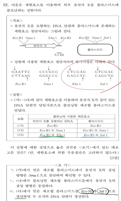 작성자Saska 작성시간 22.08.20 Xho와 Sal1은 제한효소가 인식하는 염기가 같아 재조합은 가능하지만 위의 제한효소를 사용하여 형성된 재조합 플라스미드를 사용했던 제한효소로 다시 자르는것은 불가능하기 때문에 EcoR1으로만 잘려 원형의 플라스미드를 EcoR1 부위만 자르면 하나의 선형의 플라스미드가 되기 때문입니다!!
