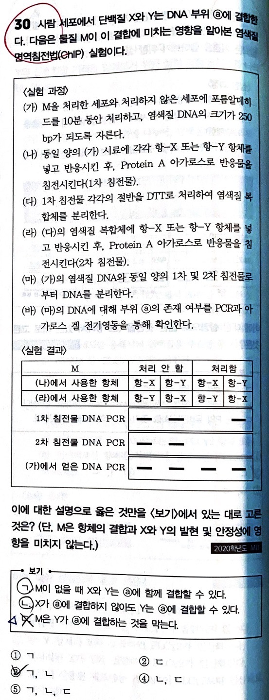 이제 (나)에서 항X-항체를 처리하면, X단백질-항체 복합체만 침전되어 1차 침전물에는 X-항체 복합체만 존재하게 됩니다. 즉, DNA가 포함되어 있지 않은 침전물이라는 것이죠.
