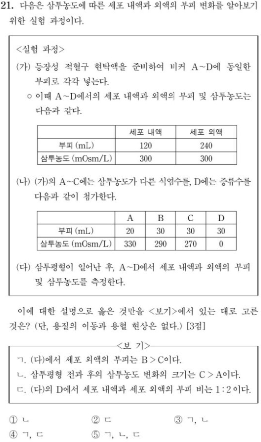 작성자飛烏 작성시간 23.02.20 2014-PEET-21 [세포] 삼투농도에 따른 세포 내액과 외액의 부피 변화