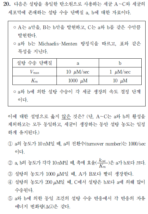 작성자cherry11 작성시간 14.11.09 Kcat/km 은 여기서 Et가 10이라고 각각 동일하게 주어졌으므로 kcat Et / km으로 고쳐 이를 (문제에서 표로 주어진 값인 ) Vmax/km으로 비교해도 좋습니다. 2번에 a는 1/100이고 b는 1/10이라서 후자가 더 큽니다. 따라서 옳지않은 보기이므로 답입니다.
