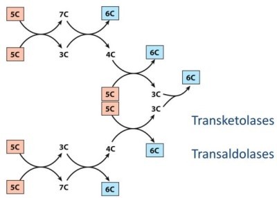 '인산5탄당'이 '인산6탄당'으로 변하는 과정(비산화 PPP)은 식물의 캘빈회로의 역반응이고 실제로 많은 효소(트랜스 캐톨레이스, 트랜스 알돌레이스)가 동일하다.