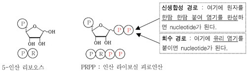 ② 회수 경로 (salvage pathway) : 핵산분해 산물을 재활용한다. 유리 염기를 다시 PRPP에 붙인다.