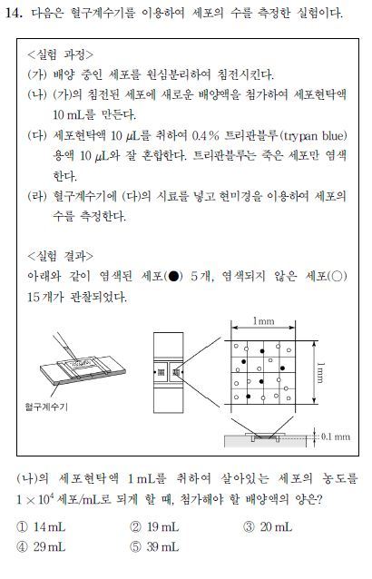 시중에 판매되는 혈구계수기(hemacytometer)의 용량은 (0.1μL = 10-4 mL)으로 규격화되어 있어서 항상 동일합니다. 외워두시면 편합니다.
