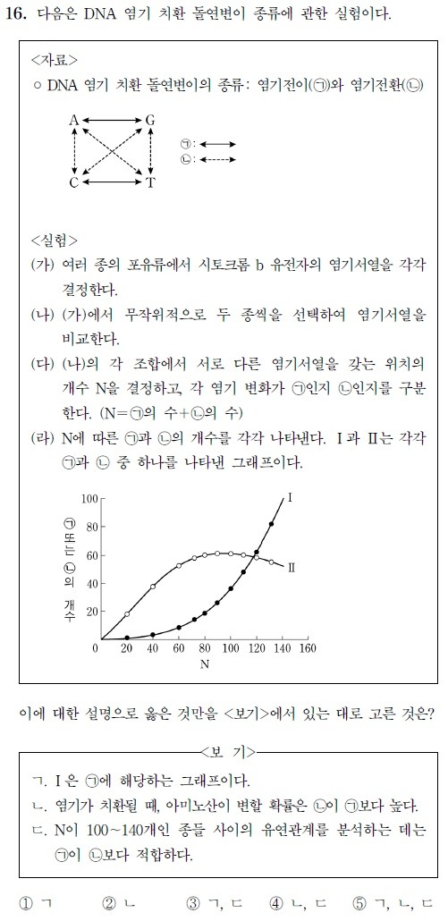 작성자옐로우나이프 작성시간 15.10.08 이 때 트리플렛 코드 표를 살펴보면 코돈의 세번 째 염기가 동일한 퓨린 또는 피리미딘끼리 바뀌었을 때에는 보통 같은 아미노산을 지정하는 경우가 많기 때문에 실질적으로 ㄱ의 돌연변이는 많아도 침묵 돌연변이에 해당해서 생물 종 사이에 큰 차이를 나타내지 않게 됩니다. 따라서 N 값이 크면 클수록 그만큼 종 사이에 차이가 많아졌다는 뜻이 되므로.. 아미노산 정보 등에 차이가 더 많아졌을 것이므로.. 퓨린-피리미딘 사이에 전환이 일어났을 확률이 더 높아지는 것이죠.