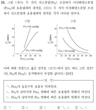 ㄴ. (가) 그래프에서 산소분압이 60인 경우와 100인 경우를 비교했을 때, 산소분압이 더 낮은 60mmHg 경우가 이산화탄소분압의 변화에 따른 호흡량의 변화가 더 크다는걸로 알 수 있나요?