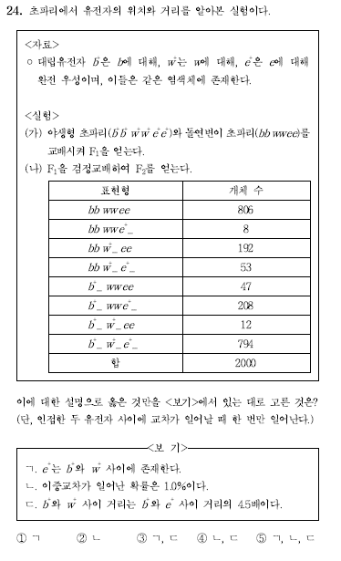 답댓글 작성자맨날맨날오잉 작성자 본인 여부 작성자 작성시간 16.09.13 샘 답변 감사드립니다 이문제는 올해 2017대비 메가md peet기출문제집에 있는 유사문제인데요(97p) 이문제의답도 5번이더라구요 그래서 저는 유전자거리를물으면 이중교차를고려하지않은 값을묻는구나라고 생각했었는데, 이문제도 좋은문제가 아니다라고 생각하면될까요?