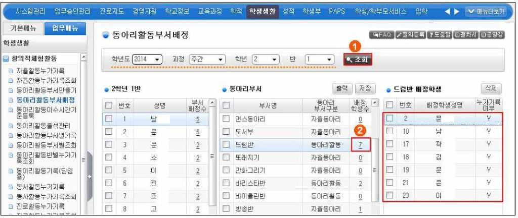 제대로 부서 배정이 되었는지 확인하려면 해당학생 이름 옆의 ②부서 배정수를 클릭하면 가장 오른쪽에 해당 학생이 배정되어 있는 부서명이 모두 검색됩니다. 잘못 배정한 경우에는 잘못된 것 앞 빈칸 클릭 후 삭제하시고 다시 위의 과정을 거치시면 됩니다.