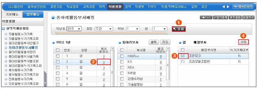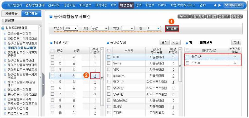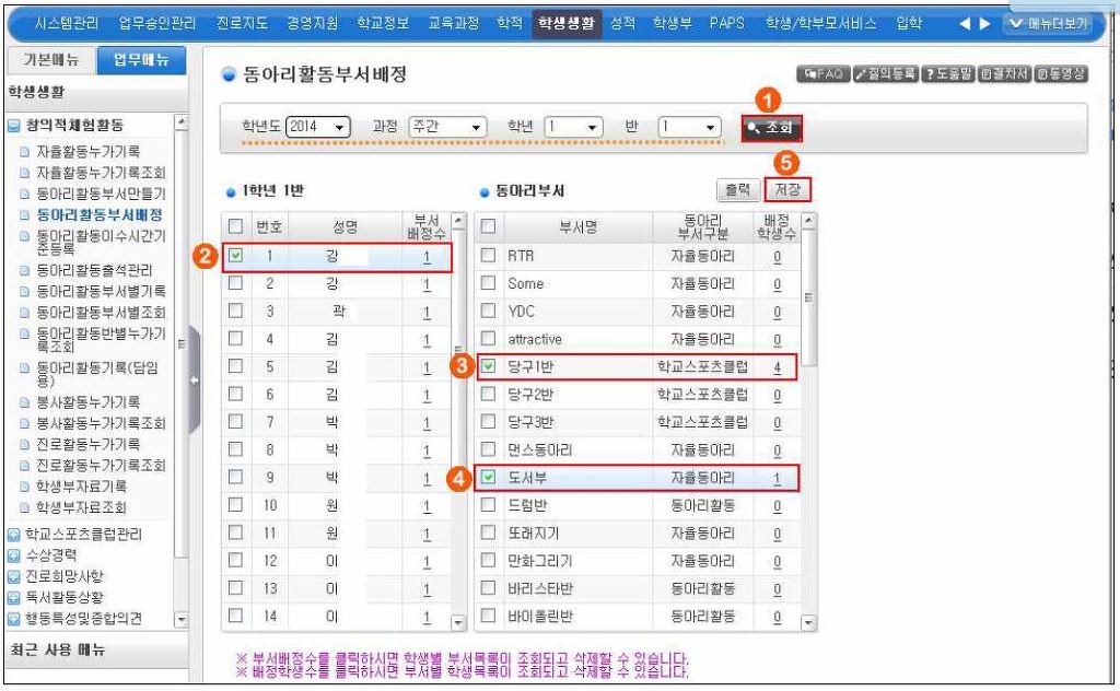 맨위 파란색 메뉴들 중 '학생생활' 클릭 -> 왼쪽 메뉴들 중 '동아리활동부서배정' 클릭 -> ① 조회를 클릭하면 우리반 학생들 명렬이 나옵니다. -> ② 부서 배정하고자 하는 학생 앞의 빈칸을 클릭하면 동아리 부서명과 학교스포츠 클럽부서명이 검색되어 나옵니다.(이 때 자율동아리가 아니라 '동아리활동'이라고 동아리부서구분에 나오는 부서 앞 빈칸을 클릭하셔야합니다.) -> ⑤ 저장클릭