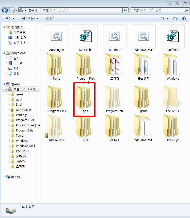 2. 저장된 인증서는 C:에 하셨을 경우 GPKI 폴더에 들어있습니다.