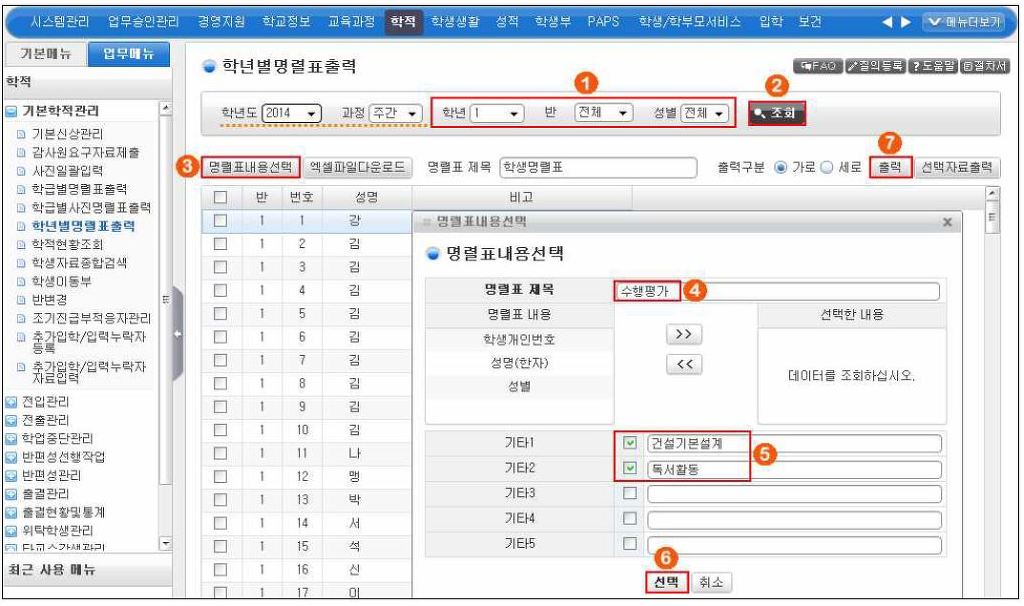 맨 위 메뉴들 중 학적 -> 왼쪽 메뉴에서 기본학적관리 클릭 -> 학년별명렬표출력 클릭-> ① 해당반을 클릭 -> ② 조회 -> 명렬표 내용선택(은 성별정도가 많이 쓰입니다.) -> ⑥선택 -> ⑦ 출력