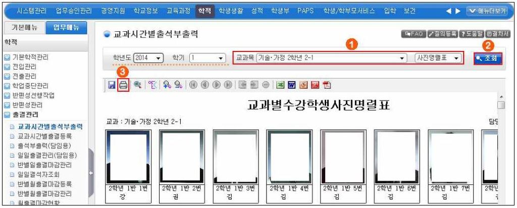 : 학적 -> 출결관리-> 교과시간별출석부출력 -> '학년도', '학기' 확인 후 '교과목', '사진명렬표' 선택 -> 조회 -> 출력함