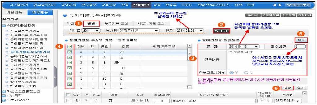 ○ '학생생활' 클릭 -> '창의젝체험활동' 클릭 -> '동아리활동부서별기록' 클릭->여러 탭 중 ① 반별 클릭 -> ② 조회를 클릭하면 학생들 명단이 뜹니다. -> 일자 콤보 박스(▼)를 누르면 등록된 날짜들이 나옵니다. 해당 날짜를 클릭 -> 이수시간은 직접 입력 -> ④ 동아리 학생 명단 맨 위 '학년' 앞의 빈칸을 클릭하면 전체 학생이 모두 선택됩니다. -> ⑤ 적용을 누르면 결석생은 자동으로 제외된다는 팝업창이 뜨고 확인하면 아래에 누가기록이 입력된 학생들의 입력사항이 뜹니다. -> ⑥ 저장을 누르면 누가기록이 입력됩니다.