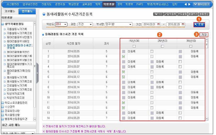 ○ 맨위 파란색 메뉴 중 '학생생활' 클릭 -> 왼쪽 메뉴 중 '창의적체험활동' 클릭 -> '동아리활동이수시간기준등록' 클릭 -> 기간 설정 후 ① 조회 클릭 -> ② 동아리활동 실시 일시 및 교시 앞의 빈칸을 클릭 -> ③ 저장