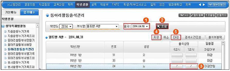 ○ 동아리활동 후 ① 일자 검색 -> ② 조회 -> 부서에 배정된 학생들이 나옵니다. ->③ 결석 또는 결과한 학생들이 있을 경우에 클릭하면 '/'가 표시됩니다.( 결석한 사유(질병/무단/기타/인정)는 담임 선생님이 확인하신 후 학급 출석부에 기재하십니다.) ->④ 저장 후 이상이 없으면 ⑤ 마감을 누르면 출결이 완료됩니다.
