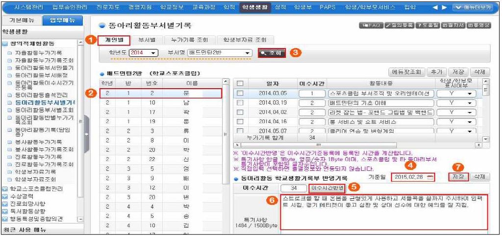 ○ '학생생활' 클릭-> '창의적체험활동' 클릭 -> '동아리활동부서별기록' 클릭 -> ① 개인별 탭 클릭 후 ③ 조회 클릭 -> ② 해당 학생 클릭(번호가 잘못되었네요 ㅋ) ->④ 기준일을 입력합니다.(한명만 해놓으면 다음 학생을 클릭해도 기준일은 유지됩니다.) -> ⑤ 이수시간 반영을 누르면 이수시간이 나오고 이 이수시간과 위의 누가기록들 맨 밑의 누가기록 합계에 나오는 시수가 일치되어야 합니다. -> ⑥ 해당 학생이 동아리활동 시간에 활동 내용 및 특기 사항을 쫑알쫑알 입력해주고 ->⑦ 저장하고 다음 학생으로 이동하여 같은 과정을 거칩니다.