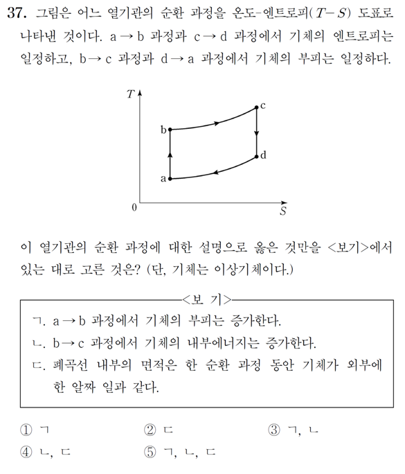 ㄷ. TS 그래프에서 b→c 과정에서 곡선과 x축 사이의 면적은 외부에서 열이 공급되어 기체의 내부에너지가 증가한 것이고, d→a과정에서 곡선과 x축 사이의 면적은 외부로 열이 방출되어 기체의 내부에너지가 감소한 것이다. 그리고 c→d, a→b의 과정은 열의 출입이 없다. 그러므로 폐곡선 내부의 면적은 한 순환과정동안 기체가 외부에 한 알짜일과 같다.이미지 확대