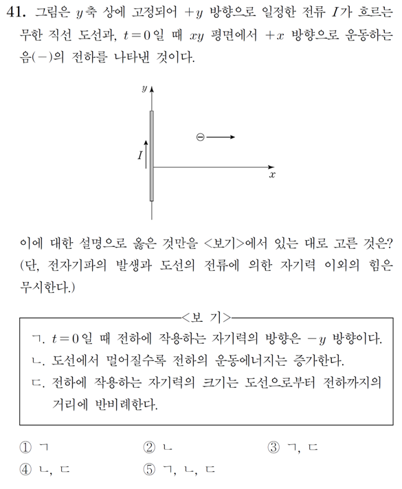 [MD]MD 12년 자연과학2 의학(41번) 치의학(44번) 작성자미생|작성시간16.02.23|조회수300 목록 댓글 2 글자크기 작게가 글자크기 크게가 MD & PEET 기출문제 풀이 목록 http://cafe.daum.net/S2000/9jMV/36 다음검색 현재 게시글 추가 기능 열기 북마크 공유하기 신고 센터로 신고 댓글 댓글 2 댓글쓰기 답글쓰기 댓글 리스트 작성자미생 작성자 본인 여부 작성자 | 작성시간 16.02.23 3번 작성자미생 작성자 본인 여부 작성자 | 작성시간 16.03.02 ㄱ. 자기장이 -z방향으로 존재할 때 양전하가 -x방향으로 움직인다고 간주하면 자기력이 -y방향으로 작용한다.ㄴ. 도선에서 멀어져도 음전하의 x축 방향 속도가 변하지 않으므로 운동에너지는 같다.ㄷ. 자기장의 크기가 거리에 반비례하므로 자기력의 크기도 거리에 반비례한다. 댓글 전체보기