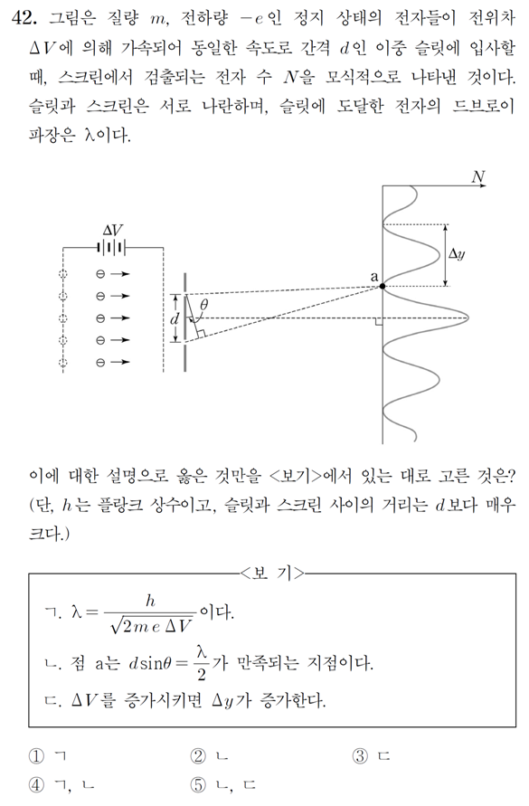 [MD]MD 12년 자연과학2 의학(42번) 치의학(45번) 작성자미생|작성시간16.02.23|조회수524 목록 댓글 2 글자크기 작게가 글자크기 크게가 MD & PEET 기출문제 풀이 목록 http://cafe.daum.net/S2000/9jMV/36현대 / 물질파 다음검색 현재 게시글 추가 기능 열기 북마크 공유하기 신고 센터로 신고 댓글 댓글 2 댓글쓰기 답글쓰기 댓글 리스트 작성자미생 작성자 본인 여부 작성자 | 작성시간 16.02.23 4번 작성자미생 작성자 본인 여부 작성자 | 작성시간 16.03.02 ㄱ. ½mv² = e∆Vλ = h/mv = h/√{2me∆V}ㄴ. dsinθ = (λ/2)(2m+1), m=0이므로dsinθ = λ/2ㄷ. ∆y = λL/d,∆V가 커지면 λ가 작아진다. 그러므로 ∆V가 커지면 ∆y가 줄어든다. 댓글 전체보기