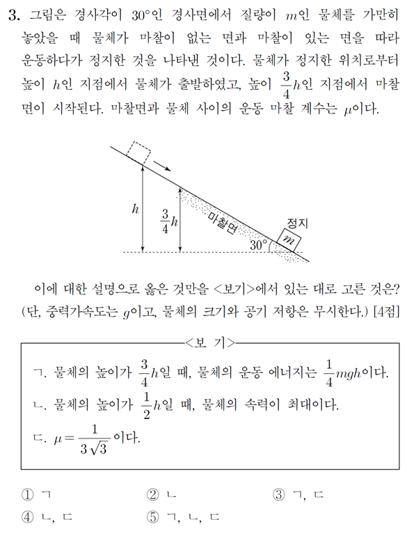 [PEET]PEET 물리추론 13년 3번 작성자미생|작성시간16.02.24|조회수278 목록 댓글 2 글자크기 작게가 글자크기 크게가 MD & PEET 기출문제 풀이 목록 http://cafe.daum.net/S2000/9jMV/36 다음검색 현재 게시글 추가 기능 열기 북마크 공유하기 신고 센터로 신고 댓글 댓글 2 댓글쓰기 답글쓰기 댓글 리스트 작성자미생 작성자 본인 여부 작성자 | 작성시간 16.02.24 1번 작성자미생 작성자 본인 여부 작성자 | 작성시간 16.03.02 ㄱ. 위치 에너지의 감소가 운동 에너지의 증가와 같다.ㄴ. 마찰이 있는 면에 진입하면서 속력이 감소하기 시작하므로, 3/4h에서 물체의 속력이 최대이다.ㄷ. (3/4)h 지점에서의 역학적 에너지가 마찰이 한 일로 변했다.mgh = μmgcos30˚×(3/2)hμ = (2/3)/cos30˚ = 4/(3√3) 댓글 전체보기