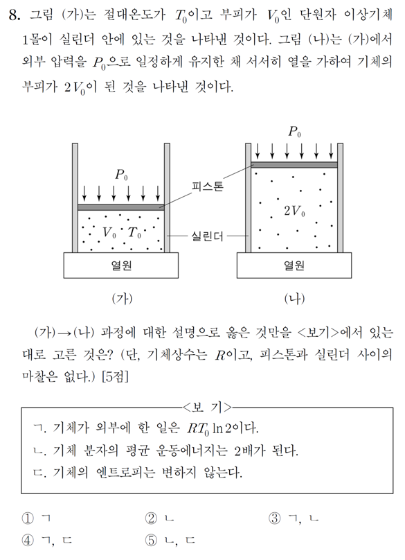 [PEET]PEET 물리추론 13년 8번 작성자미생|작성시간16.02.24|조회수325 목록 댓글 3 글자크기 작게가 글자크기 크게가 MD & PEET 기출문제 풀이 목록 http://cafe.daum.net/S2000/9jMV/36 다음검색 현재 게시글 추가 기능 열기 북마크 공유하기 신고 센터로 신고 댓글 댓글 3 댓글쓰기 답글쓰기 댓글 리스트 작성자미생 작성자 본인 여부 작성자 | 작성시간 16.02.24 2번 작성자미생 작성자 본인 여부 작성자 | 작성시간 16.03.03 ㄱ. 기체가 외부에 한 일 ∆W = P(2V - V) = PV = RTㄴ. 기체 분자의 평균 운동에너지는 (3/2)kTT_f = 2T이므로 2배이다.ㄷ. 기체의 엔트로피는 증가한다. 답댓글 작성자미생 작성자 본인 여부 작성자 | 작성시간 16.09.12 합ㄱ겨겨격 (5/2)Rln2 말씀하시는 거죠? 그런 것 같아요~ 이미지 확대 댓글 전체보기