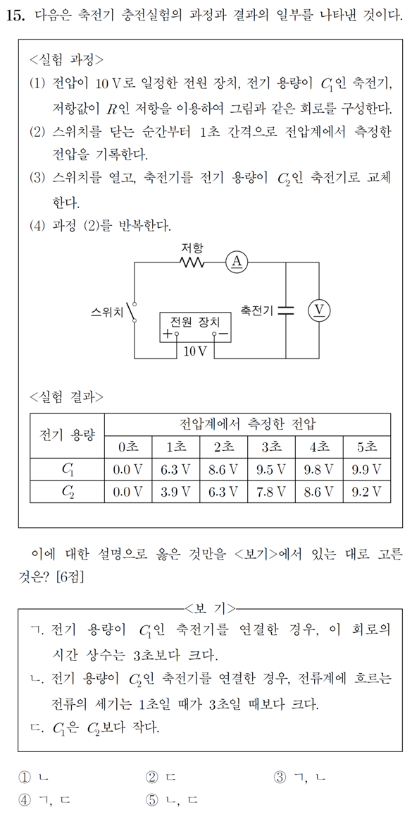 ㄷ. 시간 상수 τ = RC. 축전기 C_2에서 시간 상수가 크므로 축전기 C_1보다 천천히 변화한다. 그러므로 C_1 < C_2