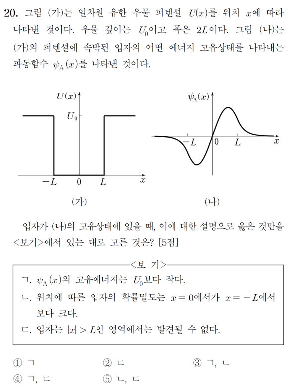 [PEET]PEET 물리추론 13년 20번 작성자미생|작성시간16.02.24|조회수548 목록 댓글 2 글자크기 작게가 글자크기 크게가 MD & PEET 기출문제 풀이 목록 http://cafe.daum.net/S2000/9jMV/36 다음검색 현재 게시글 추가 기능 열기 북마크 공유하기 신고 센터로 신고 댓글 댓글 2 댓글쓰기 답글쓰기 댓글 리스트 작성자미생 작성자 본인 여부 작성자 | 작성시간 16.02.24 1번 작성자미생 작성자 본인 여부 작성자 | 작성시간 16.03.03 ㄱ. 입자가 속박되어 있으므로 ψ(x)의 고유에너지는 Uo보다 작다.ㄴ. 위치에 따른 입자의 확률밀도는 파동함수의 제곱이다. x = 0 일 때는 입자의 확률밀도가 0이므로 x = -L에서의 확률밀도보다 작다.ㄷ. |x| > L인 영역에서 파동함수가 0이 아니므로 입자가 발견될 확률이 존재한다. 댓글 전체보기
