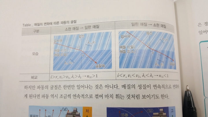 그림에서는 소한 매질에서 속도가 빠르다고 나옵니다. 여기서