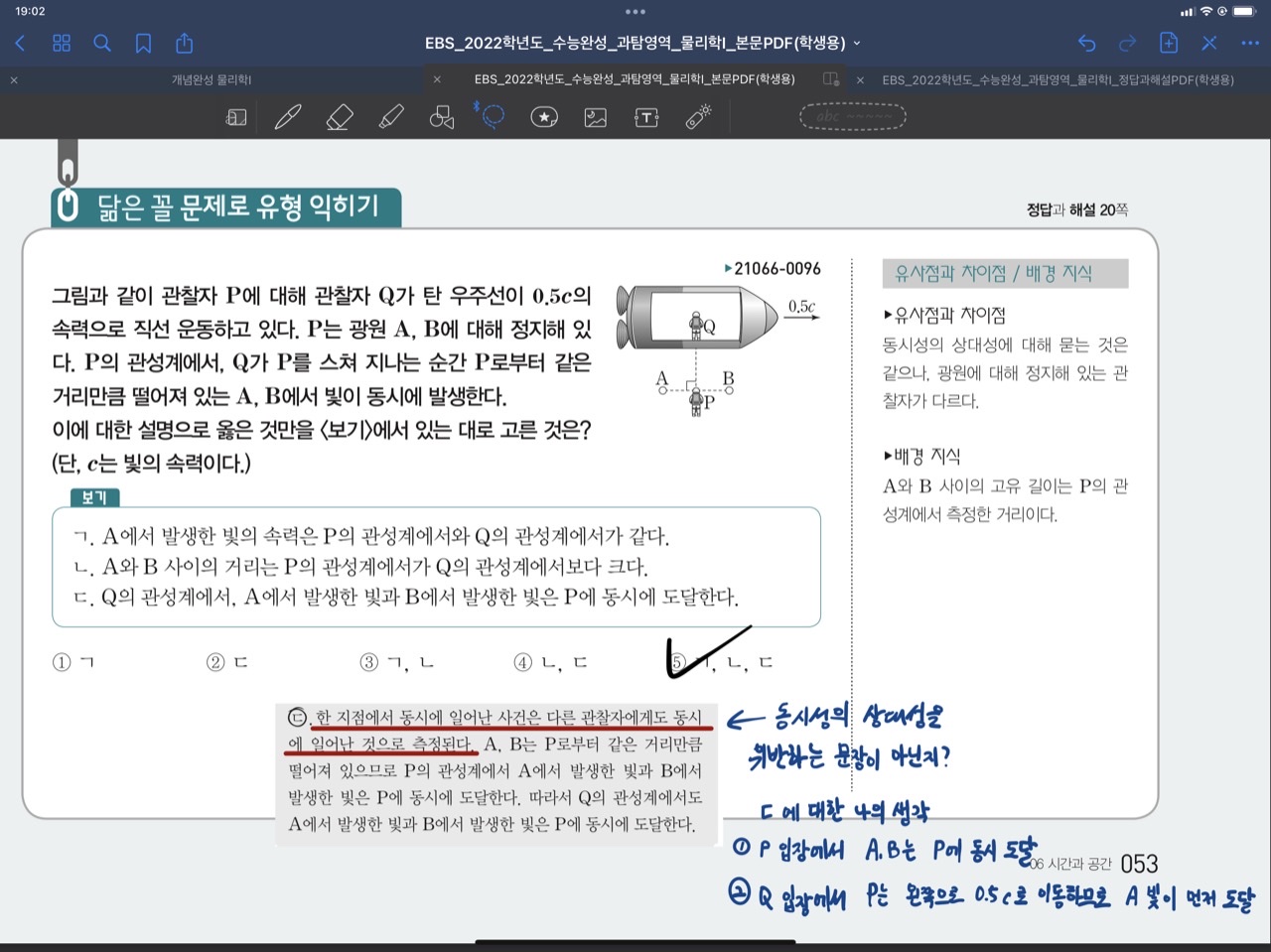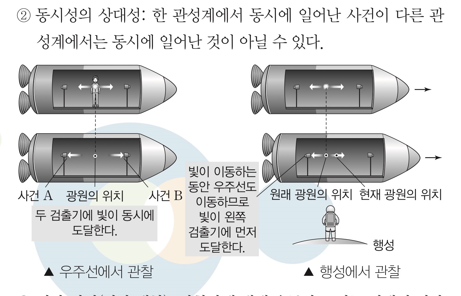 동시성의 상대성 이론에 따르면 밑줄 부분이 잘못되었다고 생각되지만 오른쪽 날개의 유사점과 차이점이 도저히 받아들여지지 않네요. 제가 뭘 놓치고 있는 것인지..? 아래의 개념 설명(p.51)과 일치하지 않습니다.