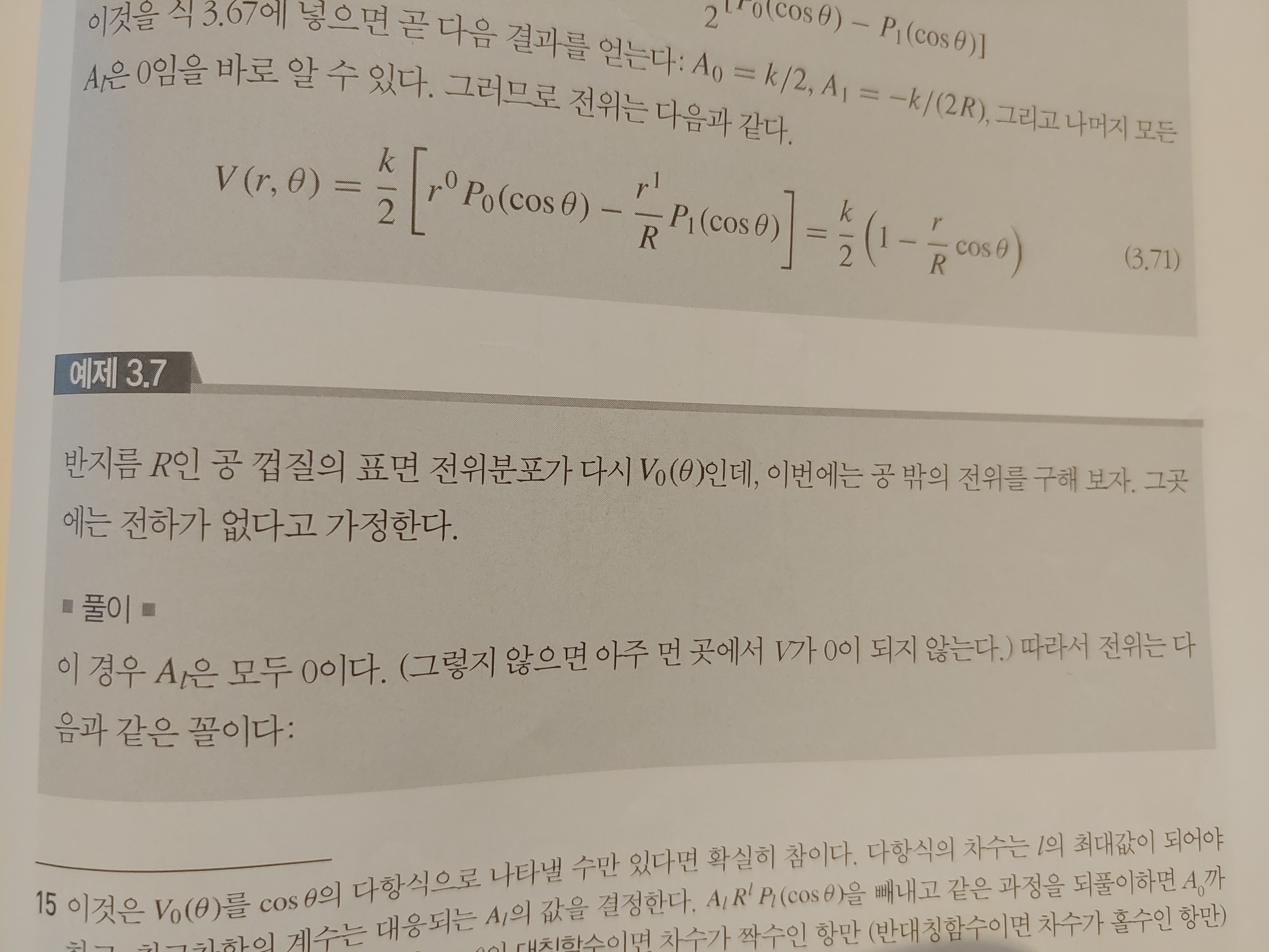 변수분리법을 쓸 수 있는 상황은 어떤 영역의 경계면에서 전위 또는 전하밀도가 명시되어 있을때 경계면 안쪽의 전위를 구하는 경우라고 그리피스 책에 적혀 있는데, 위의 예제에서는 공 밖의 전위를 구할 수 있는게 이해가 잘 안되네요ㅠ 공 속의 전위만 구할 수 있는거 아닌가요?