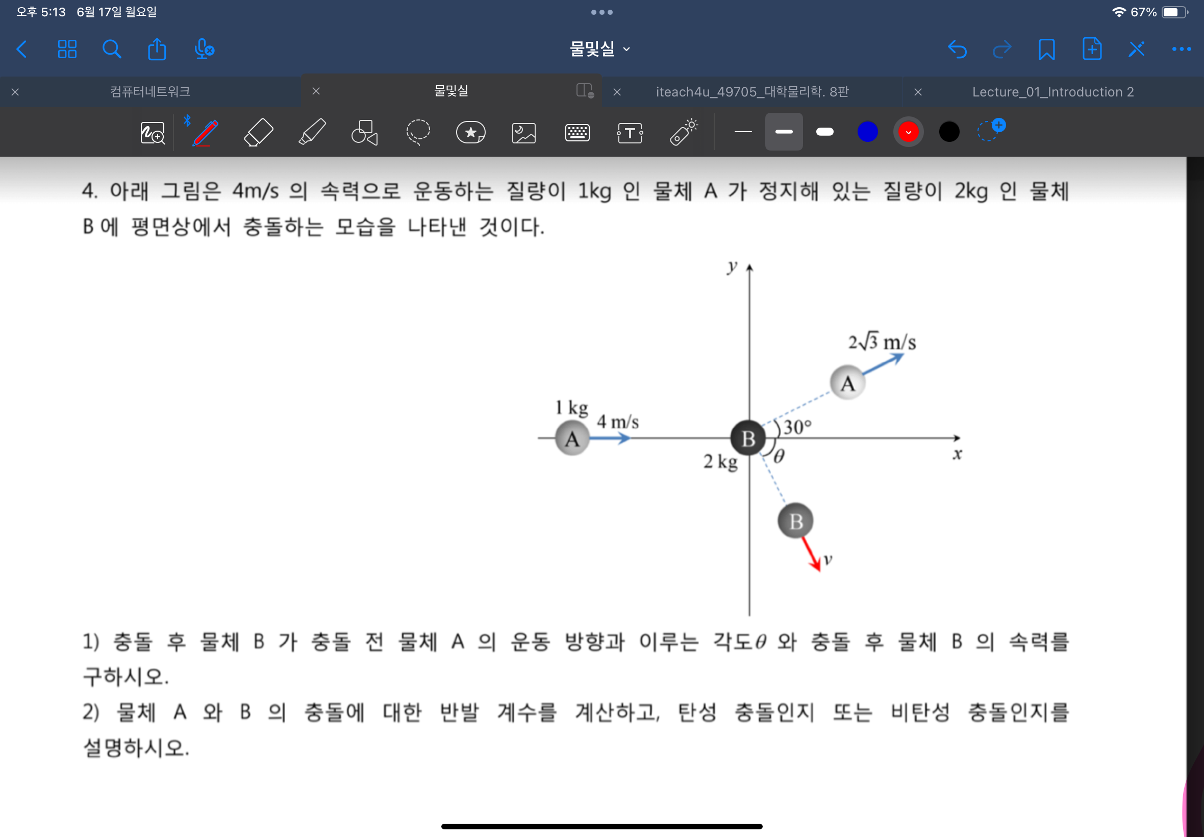 1번의 답은 구했어요. B의 충돌이후 세타는 60. v=1m/s로 나왔습니다.